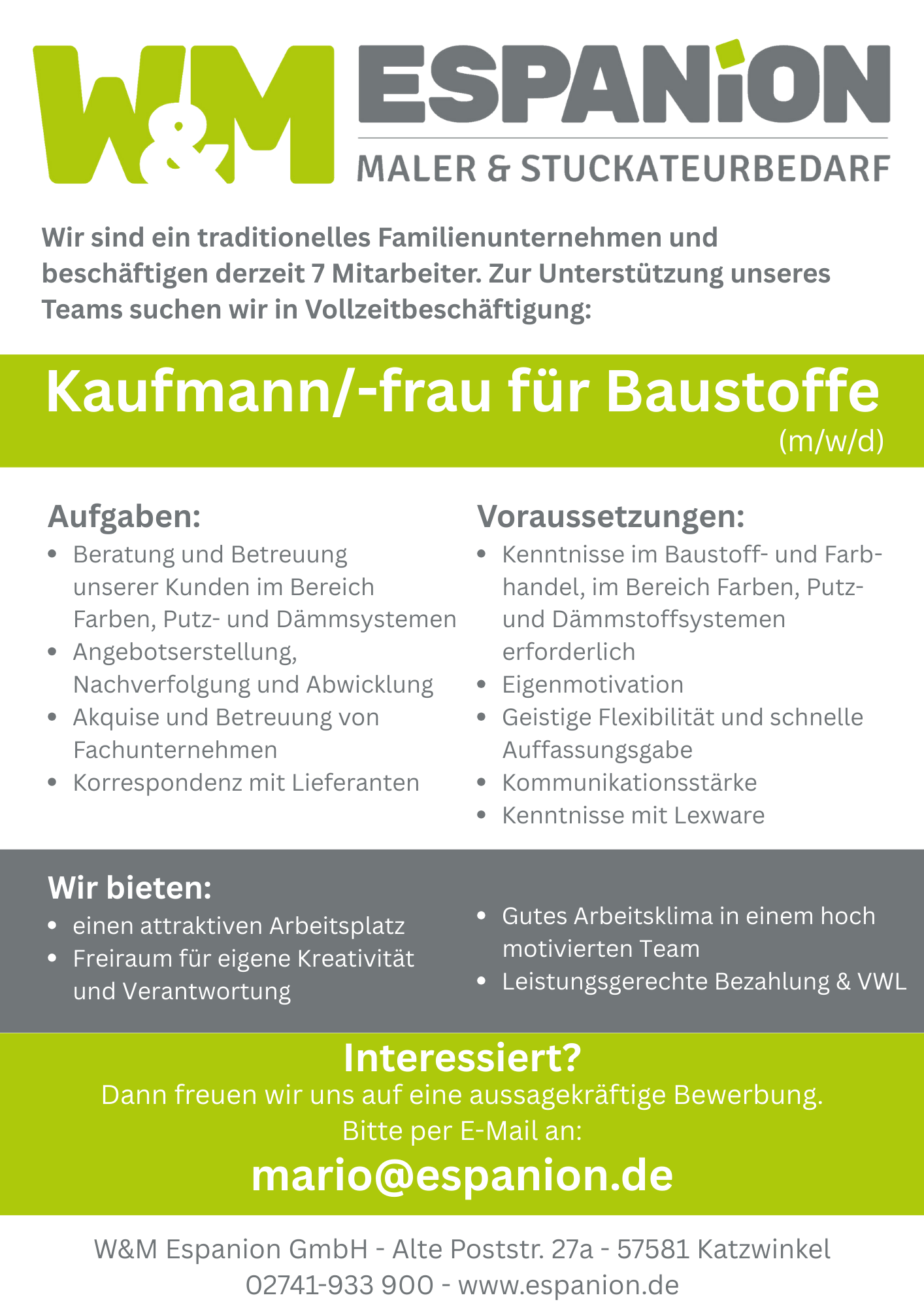 - Kenntnisse im Baustoff- und Farbhandel, im Bereich Putz- und Dammstoffsystemen erforderlich